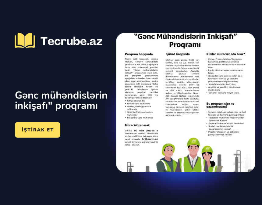 “Norm” ASC “Gənc mühəndislərin inkişafı” proqramını elan edir. Proqram çərçivəsində bacarıqlı, özünə inanan, sənaye sahəsindəki yeniliklərə açıq və yeni çağırışlara hazır olan gənc mühəndislər Norm Sement zavodunda nəzəri və praktiki təcrübə keçib, karyeralarını şirkətdə davam etdirmək imkanına sahib olacaqlar.