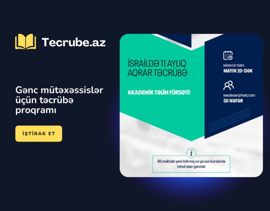 Azərbaycan Respublikasının Kənd Təsərrüfatı Nazirliyi və İsrailin Arava Beynəlxalq Kənd Təsərrüfatı Tədris Mərkəzi (AICAT) aqrar sahədə fəaliyyət göstərən gənc mütəxəssislər üçün növbəti təcrübə proqramı elan edir. 11 ay davam edəcək proqram çərçivəsində 50 nəfər gənc İsrailin fermer təsərrüfatlarında təcrübə keçmək imkanı qazanacaqlar. Bundan başqa, proqram iştirakçıları həm aqrar, həm də iqtisadi sahədə akademik təlimlərdə iştirak edə biləcək.