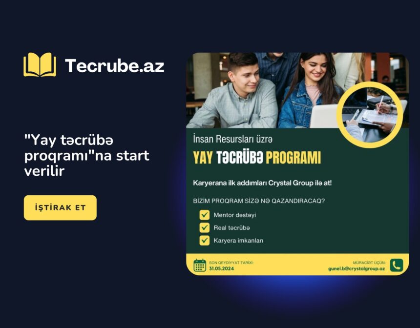 “CRYSTAL GROUP OF COMPANİES” tərəfindən “Yay təcrübə proqramı”na start verilir. Proqram ali təhsil müəssisələrinin bakalavriat (4-cü kurs) və magistratura səviyyələri üzrə təhsil alan tələbələr, həmçinin 2022-2023-cü tədris ili üzrə təhsilini tamamlamış məzunlar üçün nəzərdə tutulub. Təcrübə proqramının iştirakçıları bu müddət ərzində nəzəri biliklərini praktikada tətbiq etmək və insan resursları (HR) üzrə təcrübə əldə etmək imkanı qazanacaq. Proqramı uğurla başa vuran şəxslərə sertifikat təqdim olunacaq uğurlu namizədlər işlə təmin olun acaq.